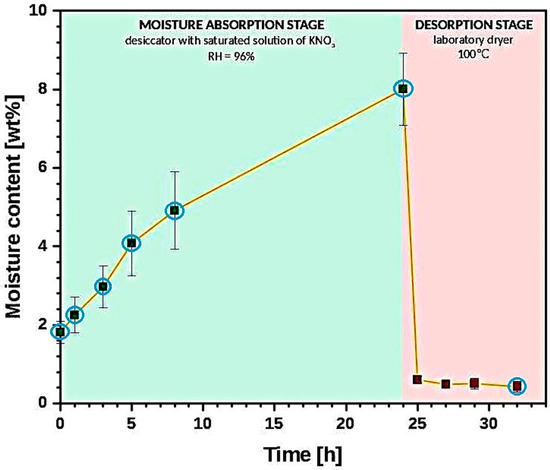 The graph in Figure 1 reveals the changes in the average moisture content (measured with Karl Fischer titration; further description in Section 2.3.3) during the moisture absorption/desorption experiment.