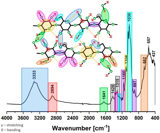 According to the information presented in Figure 3a–c different hydrogen bonds within the cellulose sample might be evidenced: intramolecular (3OH⋯O5 and 2OH⋯O6), intermolecular (6OH⋯O3′), as well as hydrogen bonds with water molecules adsorbed/absorbed by the cellulose fibers. The overall development of hydrogen bonding within a cellulose sample may be investigated with, e.g., HBI factor, shape and the intensity of some specific absorption bands (e.g., 1750–1550 cm−1, 3700–3000 cm−1).