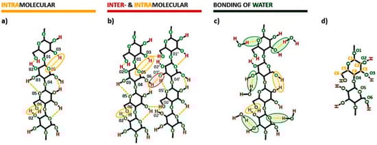 Crystalline structures of cellulose are understood as regions in which the high order of cellulose macromolecules is evidenced. The high order, in turn, is directly connected with some specific interactions present within cellulosic materials-the hydrogen bonds. Their patterns are considered as one of the most influential factors in determining the structure and properties of the discussed biopolymer [25]. Some possibilities of their formation are presented in Figure 3. Intramolecular hydrogen bonds could be created between 3OH⋯O5 and 2OH⋯O6 (Figure 3a). On the other hand, intermolecular hydrogen bonds, binding two or many macromolecules together, are mostly formed in native cellulose between 6OH⋯O3′ (Figure 3b) [24,32].