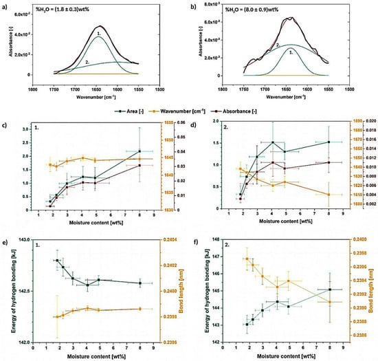 Deconvoluted absorption band between 1750–1550 cm−1 for the cellulose moisture content of (1.8 ± 0.3) wt% (a) and (8.0 ± 0.9) wt% (b) with graphs illustrating the changes in the deconvoluted peak area, wavenumber and absorbance (c,d), as well as energy and length of hydrogen bonds assigned to the resolved signals (e,f).