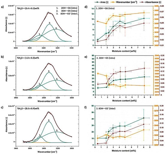 Deconvoluted absorption band between 3700–3000 cm−1 for the cellulose moisture content of (0.4 ± 0.1) wt% (a), (1.8 ± 0.3) wt% (b) and (8.0 ± 0.9) wt% (c) with graphs illustrating the changes in the deconvoluted peak area, wavenumber and absorbance (d–f).