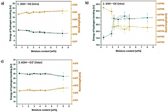 Therefore, the most important deconvolution is presented in this section, as the region 3700–3000 cm−1 is assigned to the hydroxyl groups present in the biopolymer structure [32,38]. In Figure 6a–c the resolved peak divided into three separate signals is presented. Peak no. 1 and peak no. 2 are assigned to, respectively, intramolecular 3OH⋯O5 and 2OH⋯O6 interactions, while peak no. 3 is attributed to the intermolecular 6OH⋯O3′ hydrogen bond. Additionally, it was accepted in literature that in the structure of native cellulose, intramolecular hydrogen bonds of the following types: 3OH⋯O5 and 2OH⋯O6 are present on both sides of the chain [25]. Moreover, also another theory has been proposed-the peak shifted the most to the higher wavenumber might be described as the shoulder of the large OH peak of the water originating from stretching bands belonging to OH groups engaged in hydrogen bonding. Moisture visible in this region could be considered as a more loosely bound water-indirectly via another water molecule [35]. The hydrogen bonding energy variations are revealed in Figure 7.