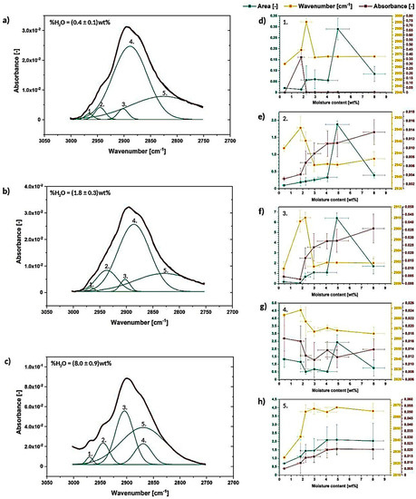 In the carried out research, it could be observed for the first time, how the area, wavenumber and absorbance of the deconvoluted signals change with the raising moisture content (Figure 5c,d). It is easily seen that peak no. 1 (sharp and high) is not shifting its wavenumber with the absorbance and area variations during the water absorption [dry state-(1650 ± 10) cm−1; wet state-(1644.6 ± 0.6) cm−1]. However, an opposite situation might be detected in case of the peak no. 2 (flat and wide)—its wavenumber shifts significantly from (1638 ± 7) cm−1 to lower values with the increasing moisture content. An interesting observation might be that the area and absorbance changes seems to exhibit the same trend regarding both analyzed signals.