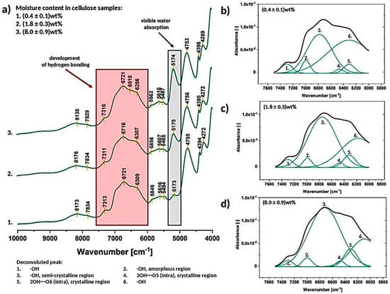 Exemplary near infrared spectra of cellulose of different moisture content (a) with deconvoluted absorption band between 7500–6000 cm−1 for the cellulose moisture content of (0.4 ± 0.1) wt% (b), (1.8 ± 0.3) wt% (c) and (8.0 ± 0.9) wt% (d).