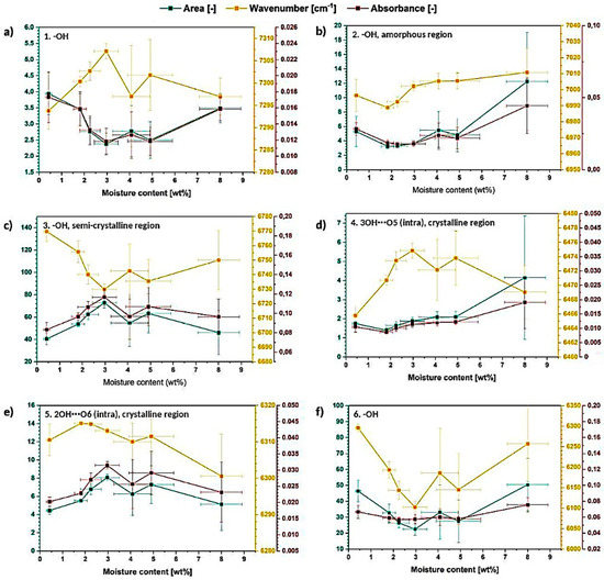 As it was mentioned before, the broad peak between 7500–600 cm−1 was resolved into 6 separate signals (Figure 9b–d) assigned to different types of −OH interactions: peak no. 1- hydroxyl groups, peak no. 2- hydroxyl groups in the amorphous region, peak no. 3- hydroxyl groups in the semi-crystalline region, peak no. 4–3OH⋯O5 (crystalline region), peak no. 5–2OH⋯O6 (crystalline region), peak no. 6- hydroxyl groups [43].