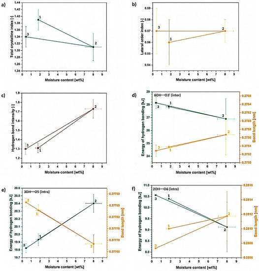 Summarizing the gathered information, moisture content seems to highly affect the intensity of hydrogen bonds within the cellulose macromolecules causing their development. According to the literature, this may be expected that the biopolymer crystallinity degree would increase as the hydrogen bonds are known to favor the high order of the cellulose macromolecules [31,39].