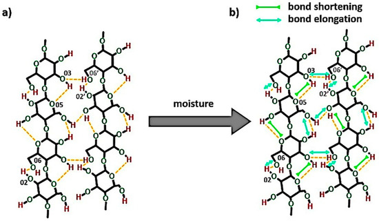 The scheme of the possible changes in the bond lengths while cellulose is subjected to the humid atmosphere (RH = 96%): (a) system of hydrogen bonds in the dry cellulose fibers, (b) system of hydrogen bonds in the cellulose of (8.0 ± 0.9) wt% moisture content.