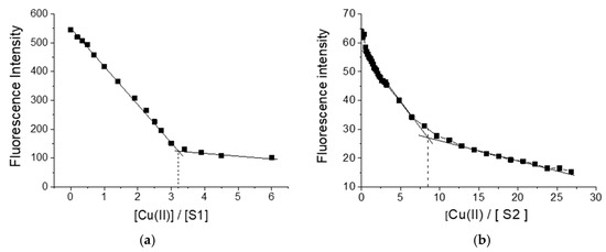Figure 1 shows the change in fluorescence intensity during the titration of S1 and S2 with copper ions. As seen, in both cases, quenching of the fluorescence intensity of polymers was observed. When using S1 as a ligand, three copper ions formed a complex with one polymer molecule, while in the case of polymer S2, the complex was formed by one polymer ligand with eight copper ions.
