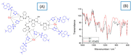To clarify the structure of the copper complexes, IR spectral and EPR analysis of S1 and S2 ligands and the respective copper complexes [Cu3(S1)] and [Cu8(S2)] were performed. Figure 2 shows the chemical structure of the copper complex of S1 and its IR spectrum, which is compared to that of the initial ligand. Data suggest that the copper ions form a coordinative bond with nitrogen atoms. As Figure 2A demonstrates, the copper ions deprotonate the secondary amino group of the sulfonamide group and the signal at 1609 cm−1 found in the S1 spectrum disappears in that of the copper complex. This probably changes the polarization of S=O from the sulfonamide structure and the intensity of the characteristic vibration peak at 1357 cm−1 decreases significantly [21]. A change in the intensity of the peak was also observed at 1660 cm−1 due to the vibration of the amide group after the complex had been formed. That gives a reason to propose the formation of a coordinate bond between the copper ions and the nitrogen atoms as shown in Figure 2A. On the other hand, the characteristic peak for S=0 at 1142 cm−1 does not change its position and intensity, indicating that the oxygen atom does not coordinate with the copper ions [22]. These observations were confirmed by the solid-state EPR analysis of the compounds. Similar spectral behavior was observed for S2 and [Cu8(S2)].