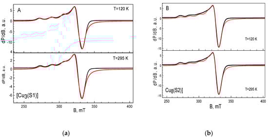 EPR spectra of [Cu3(S1)] (a) and [Cu8(S2)] (b) complexes. The black and red lines correspond to the experimental and simulated spectra, respectively.