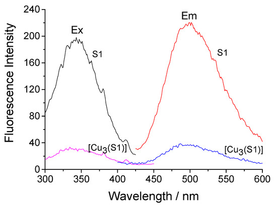 Excitation (Ex) and fluorescence (Em) spectra of cotton fabric treated with S1 and its [Cu3(S1)] complex.