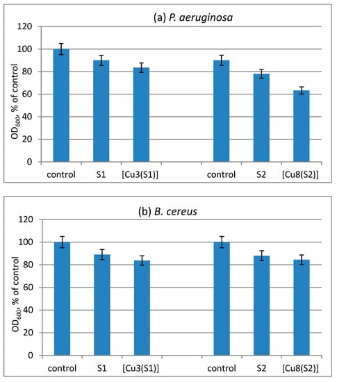The antimicrobial effect of cotton fabrics treated with S1 and S2 compounds and their Cu-complexes was evaluated by the reduction of the growth of B. cereus and P. aeruginosa. Since the tested compounds have a high molecular weight and are insoluble in water, they adhere firmly to the cotton matrix. The direct contact with bacterial cells contributes to the antimicrobial effect of the treated cotton fabrics in solution. We found a low reduction of the growth of the test strains by the cotton samples treated with ligands S1 and S2. A slightly enhanced antibacterial activity of the cotton samples treated with metal complexes was observed (Figure 5).