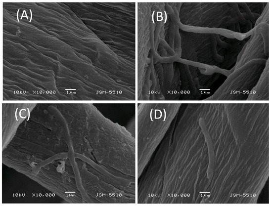 SEM micrographs of cotton fabric samples tested against B. cereus at a 10,000× magnification: (A) virgin cotton fabric; (B) biofilm on a virgin cotton fabric; (C) reduced biofilm formation on a S1-treated cotton fabric; (D) absence of biofilm on cotton fabric treated with [Cu3(S1)].