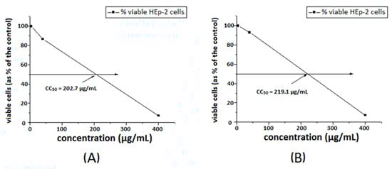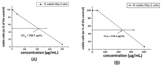 Cytotoxic concentration at 50% of ligand S2 (A) and [Cu8(S2)] (B) in HEp-2 cell culture.