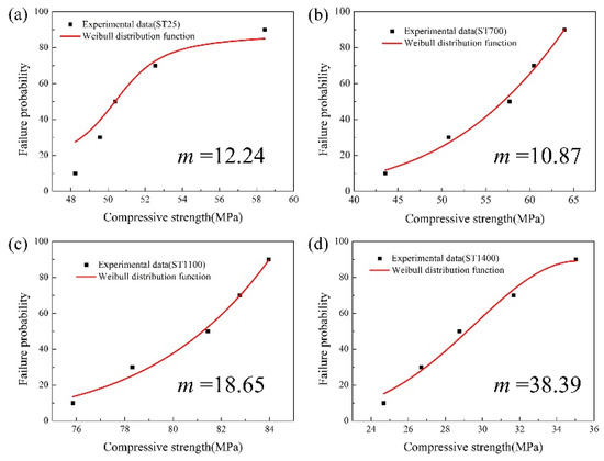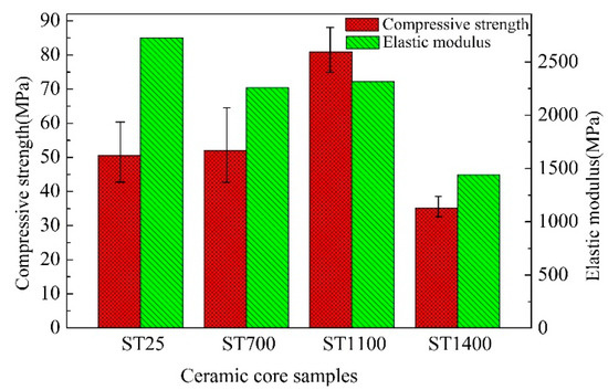 - In the temperature range from 25 to 1400 °C, the elastic moduli of the SiO2-based ceramic cores range from 1442 to 2726 MPa at the elastic stages. The statistical results of Weibull moduli show that the stability of deformation increases with the increase of temperature.