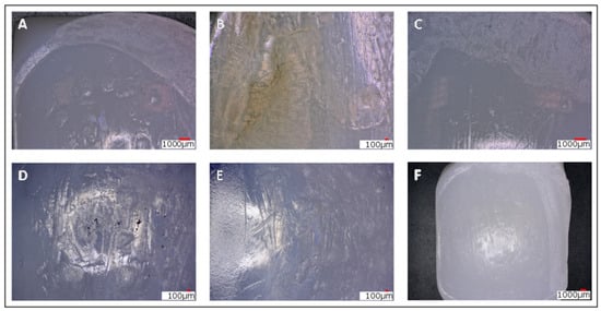 (A) Edge loading and abrasion in the anterior medial border of the inlay, pitting throughout the inlay, small scratches; (B) delamination at the anterior medial border of the inlay (noticeable at the brown change in color little pitting and scratching; (C) abrasion, scratching, and little pitting; (D) embedded particles (small black dots, possibly metal debris), a lot of scratching and pitting; (E) burnishing (see changes of regular manufacturing marks on the left side to a polished surface); (F) surface deformation, edge loading, abrasion, and a little pitting and scratching.