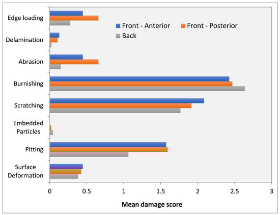 The data collected showed a comparable result between the two independent examiners (R = 0.82). The predominant type of damage was burnishing, followed by scratching and pitting. Edge loading, abrasion, and surface deformation were less common, while delamination and embedded particles were seen very rarely (Figure 3). Burnishing showed the highest number for all portions of the bearing, scratching—while seen in every specimen—was equally distributed over the Hood score. Pitting was also evenly distributed, yet some inlays did not exhibit any signs of pitting.