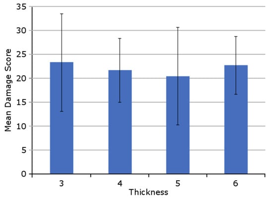 An ANOVA was conducted to compare damages for the four different bearing sizes. The mean total damage scores did not differ significantly in the four groups in this cohort (p = 0.86; Figure 4).