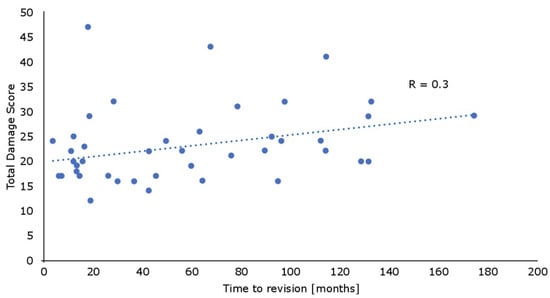 With the increasing time to revision, the total damage score increased (p < 0.05), but this correlation was weak (R = 0.3).