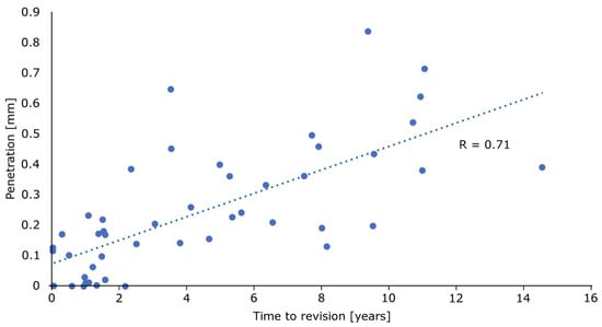 There is a strong correlation between the time to revision and penetration (R = 0.71; p < 0.001; n = 47).