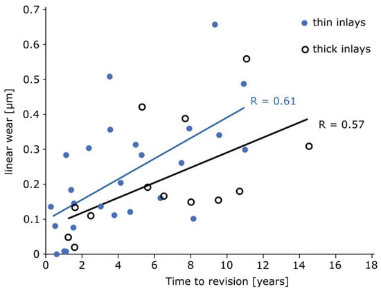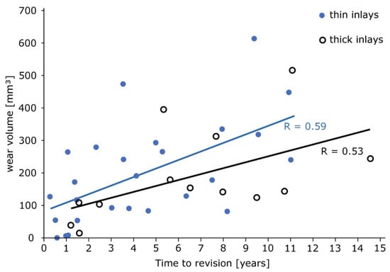 The total damage score and the linear penetration did not show any correlation (R = 0.137; p = 0.383). The approximated wear volume for all inlays increased over time (R = 0.53, p = 0.001). The mean approximated wear volume for low-thickness inlays was 26.3 mm³ per year (R = 0.59, p = 0.001) and for high-thickness inlays 18.0 mm³ per year (0.53, p = 0.001) without significant differences (Figure 8, p = 0.196).