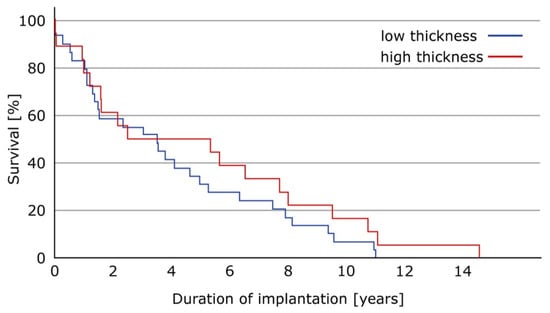 The penetration of 37.5 µm per year for low thickness and 27.6 µm per year for high thickness bearings is in range with studies published previously. Engh et al. described rates of approximately 50–60 µm per year for the medial and 30 µm for the lateral compartment in a type of total knee replacement [], which is in line with results reported by Kop and Swarts who reported 54 µm for the superior surface of LCS knees []. For the Oxford unicompartmental knee arthroplasty, Horsager et al. described wear rates of 40 and 50 µm per year for the cemented and cementless versions, respectively, which is slightly lower than what we have seen in our cohort []. The aforementioned study was conducted using the radiostereometic analysis (RSA), which has been shown to produce accurate results in total knee replacement wear analysis [,]. However, no study comparing wear assessed by RSA and subsequently by the retrieval analysis has been conducted so far, to the best of our knowledge, and a certain error in measurement has to be accepted. In the present study, a direct measurement of the retrieved inlays was possible, which can be assumed as the most valid form to measure inlay penetration.