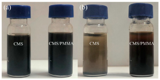 Digital pictures of carbon microspheres (CMS) and CMS/PMMA dispersions (a) immediately after sonication and (b) 8 weeks after sonication [80]. Reproduced with permission from [Yuefeng Gu et al.], [The Journal of Physical Chemistry C]; published by [American Chemical Society], 2019.