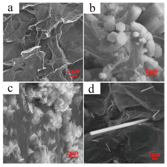Micromorphology of synthesized nanoparticles: (a) graphene, (b) prism-like ZnO@graphene, (c) sheet-like ZnO@graphene, (d) rod-like ZnO@graphene [86]. Reproduced with permission from [Baijing Ren et al.], [Tribology International]; published by [Elsevier], 2020.