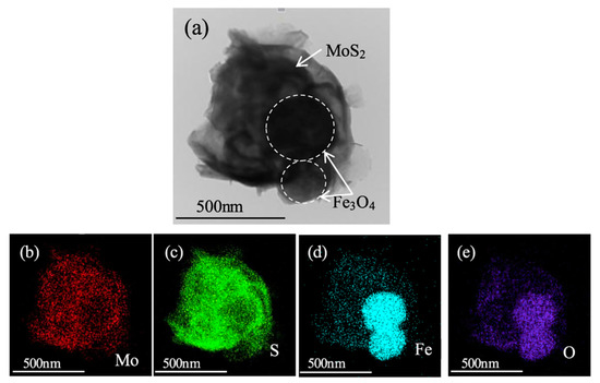 TEM (a) image and corresponding elemental mapping (b–e) images of Fe3O4@MoS2 nanocomposites [87]. Reproduced with permission from [Yufu Xu et al.], [Tribology International]; published by [Elsevier], 2018.