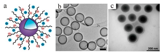 For the sol–gel method, the core materials and shell precursors were dispersed in solutions, which was followed by the formation of active monomers through hydrolysis reactions of precursors. Afterwards, the active monomers polymerize to form sols and then generate gels with certain spatial structures on the surface of core materials. After drying and heat treatments, the desired core–shell particles are prepared. A two-step sol–gel method was developed by Wang et al. [20], and they added ether and H2O in sequence to a polysulfone (PSF)-containing dimethyformamide (DMF) solution to facilitate PSF solidifying on the surface of a glass bead to prepare monodispersed glass bead@polysulfone microspheres. Their results proved that the two-step sol–gel method is a highly efficient process for the preparation of glass bead@polysulfone microspheres with 80% and almost 100% utilization rates of PSF and glass beads, respectively. The sol–gel method is the most commonly used way to synthesize SiO2 core–shell particles through the hydrolysis of TEOS (tetraethyl orthosilicate). Marini and co-workers [21] managed to prepare organic–inorganic hybrid core–shell nanoparticles with a PE–PEG (α-hydroxy-terminated poly(ethylene)-block-poly(ethylene glycol)) amphiphilic tapered shell and an inorganic-rich core (SiO2) in a high yield by a simple one-step catalyzed sol-gel reaction using TEOS and triethoxysilane-terminated polyethylene-b-poly(ethylene glycol) as reactants with low cost. What is more, SiO2 nanoparticles with a covalently grafted PEtOx(poly(2-ethyl-2-oxazoline)) shell were fabricated by the sol–gel method [22]. Afterwards, SiO2@PEtOx particles were transformed into SiO2@P(EtOx-stat-EI) under acidic conditions to invert the surface charge from negative to positive, which could be used to deposit Au nanoparticles subsequently for nonviral gene delivery.