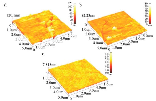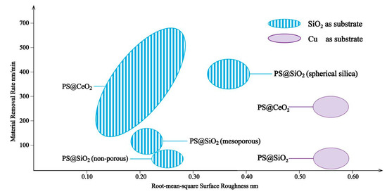 Compared with conventional abrasives, core–shell structured abrasives have many advantages. The elastic moduli of the abrasives can be adjusted by controlling the hardness of core materials and the thickness of the shells to fit the substrates [93]. The soft core can deform elastically and increase the real contact area between abrasives and substrates to reduce the contact stress and prevent the appearance of the scratches on substrates. The existence of the shell materials can also improve the dispersion of abrasives and prevent the physical dissolving and chemical reaction between abrasives and polishing fluid. What is more, the relatively rigid shell ensures that the chemical reacted layers can be totally removed. Compared to spherical core–shell structured abrasives, the traditional abrasives such as SiO2 and CeO2 have irregular shapes and are rigid, which will easily scratch the substrate during the polishing process. The focuses of the study are mainly for non-rigid polymer core/inorganic shell materials to gain proper hardness for polishing. Table 4 and Figure 17 show the parameters of the core–shell composite abrasives in chemical mechanical polishing.