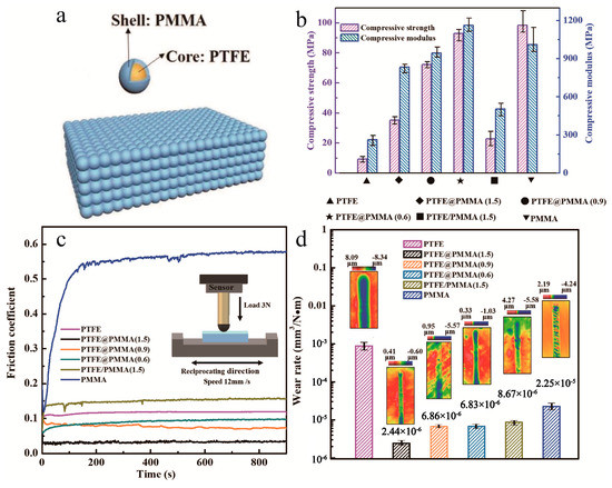 The addition of nano/microparticles into solid materials can improve both the tribological and mechanical properties, which can be obviously influenced by the structures and dispersions of nano/microparticles. The traditional mechanical mixing of fillers and matrix has the problem of phase separation or uneven dispersion of the particles, resulting in the decreases of mechanical properties of the composites, which cannot meet the technical requirements of low friction, high wear resistance, and mechanical properties of solid lubricating materials under harsh working conditions. Compared with ordinary particles, core–shell nano/microparticles possess the shell materials that can interlock the matrix and particles as well as improve the dispersion of particles in the matrix. Meanwhile, the core materials can play the roles of wear resistance, friction reduction, and fortifier. Typically, the incorporation of rigid nano/microparticles into the polymer matrix could improve the mechanical properties of the composites due to the tolerance of the particles to large plastic deformation under external forces [41,42,43]. Consequently, core–shell nano/microparticles have a broad application prospect as fillers in a solid lubricant matrix.