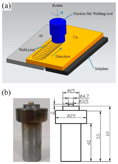 Figure 1. (a) Welding process; (b) friction stir welding tool (mm).