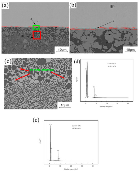 Figure 3. EDS analysis of copper–aluminum lap joint: (a) Cu-Al joining interface between copper and aluminum; (b) Intermetallic compound (IMC) layer; (c) Microstructure of crystal region; (d) c point copper and aluminum content; (e) d point copper and aluminum content.