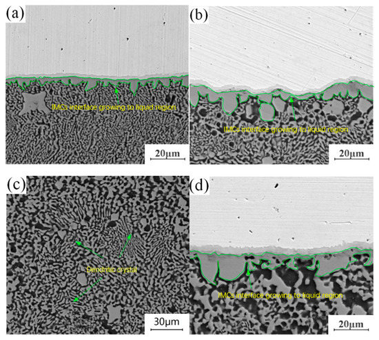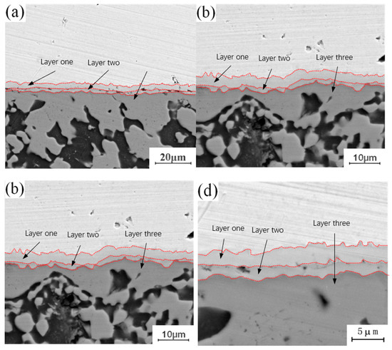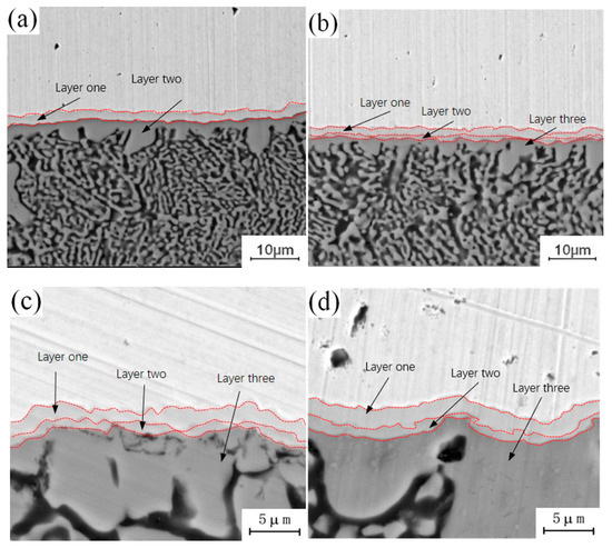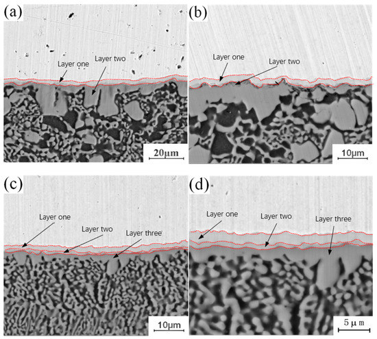 Figure 6. Microstructure of intermetallic compound (IMC) layer annealed at 400 °C for different holding times: (a) t = 0.5 h; (b) t = 1.5 h; (b) t = 3.5 h; (d) t = 4.5 h.
