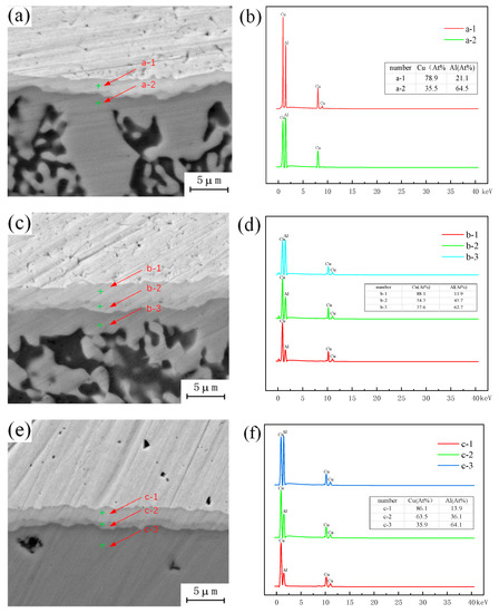 Figure 9. Microstructure of intermetallic compound (IMC) layer under different annealing conditions: (a) Annealing temperature 300 °C; (b) Content of copper and aluminum in a; (c) Annealing temperature 350 °C; (d) Content of copper and aluminum in b; (e) Annealing temperature 400 °C; (f) Content of copper and aluminum in c.