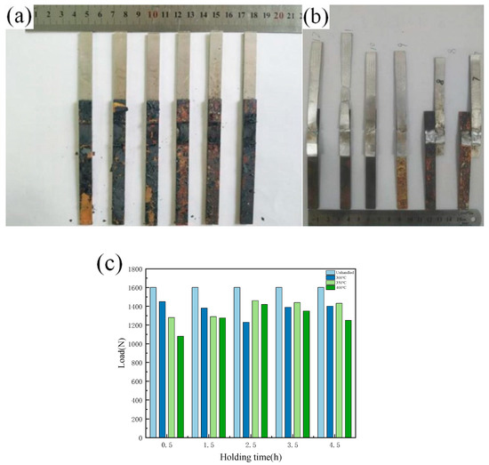The tensile specimen of the lap joint after annealing treatment is shown in Figure 11a,b. It can be seen that it is oxidized to a certain extent following annealing treatment, and there is a shedding oxide scale on the surface. Figure 11c shows the results of the tensile strength test of the lap joint following annealing treatment, when subjected to different annealing temperatures and holding times. The test results show that the tensile strength of the tensile pattern is affected by the annealing process, and that the different annealing processes have different effects on the properties of the joints. When the annealing temperature is 300 °C, there is no obvious change in the strength of the tensile sample with the change of holding time, but when the annealing temperature is 350 °C and 400 °C, the strength of the tensile sample first increases and then decreases with increasing holding time. When the holding time is 2.5, the strength of the sample reaches its maximum. The intermetallic compound (IMC) layer is formed in the dissimilar metal lap joint, and the thickness of the intermetallic compound (IMC) layer is small. After annealing, the intermetallic compound (IMC) layer grows again, and its degree of growth is positively related to the annealing temperature and holding time. Combined with the tensile test results of the joint after annealing, increasing the thickness of the intermetallic compound (IMC) layer in a certain range is beneficial for improving the strength of the joint. However, intermetallic compounds (IMCs) are brittle and hard, and too large an amount of intermetallic compounds (IMCs) will inevitably worsen the performance of the joint and reduce its strength; similarly, too long a holding time leads to a decline in performance.