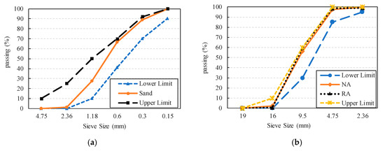 Particle-size distributions: (a) particle-size distribution of sand; (b) particle-size distribution of natural aggregate (NA) and recycled aggregate (RA).