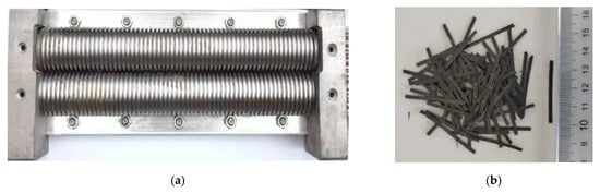 In this study, the RCFRP fibers were recovered from waste CFRP sheets with a thickness of 0.2 mm. The shredding tool shown in Figure 3a was selected to cut the waste CFRP sheets into short fibers (Figure 3b). This method only involved mechanical cutting and did not require removal of the resin in the CFRP sheets. The obtained RCFRP fibers had a regular shape, which could make good use of the tensile strength of RCFRP fibers. In addition, the RCFRP fibers could be easily dispersed in concrete, which posed a relatively small impact on the workability of the concrete. The density, tensile strength, elastic modulus, and carbon content of the waste CFRP sheets were 1.70 g/cm3, 4292 MPa, 236 GPa, and 92.5%, respectively. The waste CFRP sheets were cut into dimensions of 35 × 2 × 0.2 mm using the shredding machine, as shown in Figure 3a.