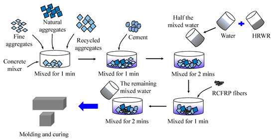The concrete preparation procedure, based on the Chinese standard [36], is illustrated in Figure 4. First, all raw materials were weighed according to the mixing ratio in Table 3. Second, NA, RA, and sand were added to the blender and stirred for 1 min. Third, cement was poured into the blender and mixed for 1 min. Forth, HRWR and water were mixed evenly, and half of the water–HRWR mixture was added to the blender and stirred for 2 min. Fifth, CFRP fibers were slowly and evenly added to avoid fiber concentration. Sixth, the remaining water–HRWR mixture was added and stirred for 2 min. Finally, the prepared mixture was poured into the 100 × 100 × 100 mm and 100 × 100 × 400 mm molds, and three specimens were made for each mix. After curing for 24 h, the samples were demolded and cured at room temperature of 20 ± 2 °C, with the humidity not less than 95%, for 28 days.