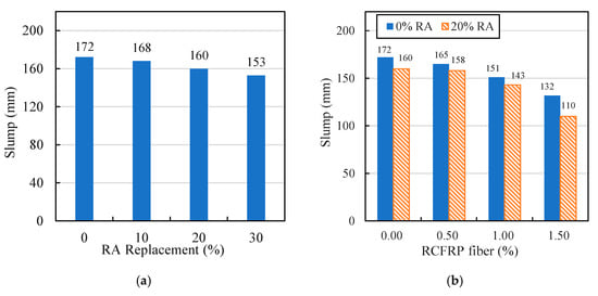 The slump results of different mixes are shown in Figure 6. The effects of different RA replacement rates on slump values of RA concrete (RAC) are presented in Figure 6a. It can be seen that as the replacement rate of RA increased, the slump value of RAC decreased due to the relatively large water absorption and rough surface of RA. The slumps of RCFRP fiber-reinforced concrete (0% RA) and RCFRP fiber-reinforced 20% RA concrete (20% RA) with different RCFRP fiber content are shown in Figure 6b. It can be seen that with the increase of RCFRP fiber content, the slump value decreased. This is because the presence of RCFRP fibers formed a three-dimensional web [38,39,40], which hindered the flowability of concrete.