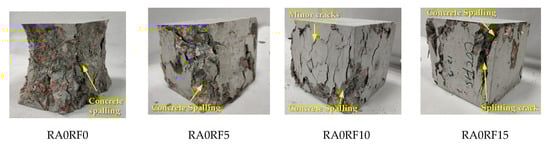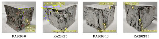 The failure observations of different specimens are shown in Figure 8. The mixes without RCFRP fiber, such as RA0RF0 and RA20RF0, experienced a shear failure. Surface concrete of these two mixes spalled, and the remaining specimens were in a cone shape. As for specimens with 0.5% RCFRP fibers (RA0RF5 and RA20RF5), diagonal shear cracks and concrete spalling were observed. For RA0RF10 and RA20RF10, the extent of concrete spalling was reduced, and some minor/splitting cracks could be observed. For RA0RF15 and RA20RF15, the extent of concrete spalling was moderate, and the specimens failed with several major splitting cracks. The experiments revealed that with the addition of RCFRP fibers, the extent of concrete spalling was alleviated, and the specimen was still in one piece owing to the bridging action of RCFRP fibers in concrete.