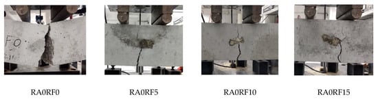 The flexural failure patterns of different mixes are presented in Figure 9. The mixes without RCFRP fiber (RA0RF0) experienced a brittle failure. When a flexural crack appeared near the mid-span, it propagated throughout the section, and the specimen broke into two pieces. As for the other mixes with RCFRP fiber addition (RA0RF5–RA0RF15), the failure pattern was more ductile. With the increase of applied displacement, a flexural crack also occurred near the mid-span. Nevertheless, the specimens remained with good integrity at the ultimate displacement, and the specimen could still sustain the applied load.