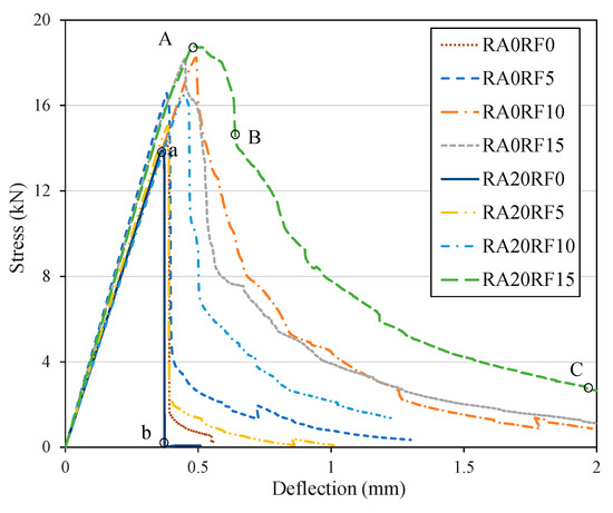 Figure 10 shows the load–deflection curves of different mixes under the four point bending test. As shown in the figure, the load–deflection curve can be divided into two stages, namely the elastic stage and the softening stage. When a relatively low load was applied, the performance of specimens with/without RCFRP fibers was similar, and all specimens exhibited elastic responses (Lines 0a and 0A in Figure 10). At this stage, there were no cracks observed in the specimens. Subsequently, with the increase of applied load, flexural cracks appeared at the bottom of the specimen. For specimens without RCFRP fiber, the flexural crack penetrated through the entire section, and the applied load dropped to 0 abruptly (Line ab in Figure 10). The failure mode of specimens without RCFRP fiber was brittle, and the failure pattern is shown in Figure 9. On the other hand, specimens with RCFRP fibers exhibited a more ductile failure mode. In the phase AB (Figure 10), the flexural crack developed to the neutral axis of the section, and the tensile force sustained by concrete gradually transferred to RCFRP fibers that stretched across the flexural crack. After point B, the crack width further developed, and the load-bearing capacity decreased more slowly than phase AB, because the RCFRP fibers could provide a relatively stable tensile force. At point C, the loading was terminated, and the specimen still had a certain residual load-bearing capacity, indicating good ductility of the specimen. The above test results show that the addition of RCFRP fiber can not only improve the flexural strength of concrete, but more importantly change the failure mode and yield a significantly better ductility.