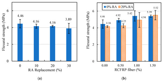 The flexural strength results of fiber-reinforced concrete and RFRAC specimens are presented in Figure 11b. It is evident that the flexural strengths of fiber-reinforced concrete and RFRAC specimens increased with the increase of RCFRP fiber content. The flexural strengths of fiber-reinforced concrete and RFRAC increased by 20.9% and 32.7%, respectively, when the RCFRP content increased from 0% to 1.5%. This is because the flexural strength of concrete was primarily determined by the tensile strength of concrete. The addition of RCFRP fiber could vastly improve the tensile strength of concrete due to the bridging effect, so that the flexural strength was significantly enhanced. It is also noteworthy that the results of flexural strength change of concrete with increase of RA were not statistical significant. This is because the flexural strength was controlled by the tensile performance of concrete, which can be influenced by various factors such as the distribution of aggregates in concrete and the interface performance between mortar and aggregate. Therefore, the flexural strength of concrete generally exhibited a relatively large deviation compared to compressive strength. Similar observation could also be found in previous studies [47].