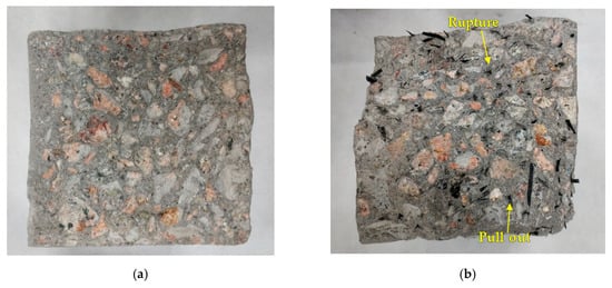 The cross sections of specimens after the flexural test are shown in Figure 12. Figure 12b demonstrates the cross section of a specimen with 1.5% of RCFRP fiber content, where the RCFRP fibers were uniformly distributed in the cross section. Some fibers were pulled out and some were broken, indicating that CFRP fibers played a key role in constraining the development of flexural cracks.