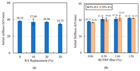 As shown in Figure 13a, the addition of RA had a negative influence on the initial flexural stiffness of concrete. This is because the porous nature of RA and the bonding of the RA–mortar interface was weak [49], which resulted in a reduction in flexural stiffness. The initial flexural stiffness of concrete with different RCFRP content is shown in Figure 13b. It can be seen that the addition of RCFRP fibers slightly increased the stiffness of concrete.