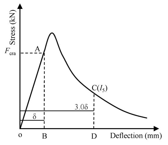 where SOAB and SOACD represent the enclosed areas of the load–deflection curve at the deflections of δ and 3.0 δ, respectively; δ is the initial crack deflection; Fcra is the initial crack strength.