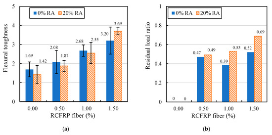 The calculated flexural toughness indexes of all mixes are presented in Figure 15a. As evident in the figure, the addition of RCFRP fibers had a positive influence on the flexural toughness of concrete. For example, the flexural toughness indexes of fiber-reinforced concrete specimens with 0.5%, 1%, and 1.5% of RCFRP fiber addition were 1.23, 1.59, and 1.89 times that of the specimen without RCFRP fiber. Meanwhile, the flexural toughness indexes of RFRAC specimens with 0.5%, 1%, and 1.5% of RCFRP fiber addition were 1.32, 1.80, and 2.60 times that of the specimen without RCFRP fiber. Therefore, the addition of RCFRP fibers can largely improve the flexural toughness of concrete.