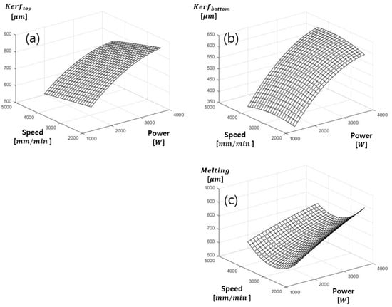 - The results of the ANOVA on the SSand SUSanalyze the effect of each independent variable on the dependent variable during laser cutting. The most effective variable in , , and melting width on SSis laser power. In the case of on the SUS the most effective variables are laser power × cutting speed. On the other hand, for the and HAZ, the interaction effects of the laser power × cutting speed have been found most effective variables. The most effective variables are determined differently on SS41 and SUS 304. This may be caused by different chemical properties of metallic materials. Especially, we assumed that the influence of Ni and Cr components in SUS304 plays a critical role in the laser cutting. Therefore, the effect of laser cutting parameters on the chemical properties of SUS304 needs further study.